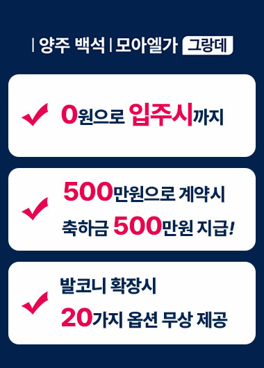 현장명 : 양주백석 모아엘가 그랑데( 1688-4008 ) 고객님들에게 보다 정확한 분양상담서비스를 제공하고자 필요한 최소한의 개인정보를 수집활용하고 있습니다.